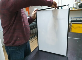Затем из металлического профиля мы изготавливаем рамку, тыльную сторону которой закрывает прямоугольный белый фон. Распечатанный на плёнке портрет мы приклеиваем к вспененной основе для придания необходимого объёма и жесткости.