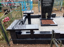 Дождавшись окончательного высыхания брусчатки вновь приезжаем на участок. Там мы восстанавливаем надписи на надгробье, размещая у его подножья восьмиконечный крестик. На этом наша работа на данном участке окончательно завершена. В результате из ничем не примечательной могилы появился презентабельный мемориальный комплекс, декорированный столиком и двумя лавочками в оградке.