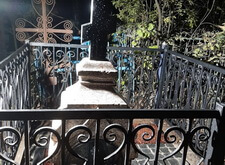 Тем временем мы изготовили табличку, закрывающую лицевую сторону надгробья, а также православный крест, венчающий памятник. Установка этих элементов завершила реставрацию памятника и мы взялись за укладку гранитной брусчатки, оставив в одном из углов участка место под квадратную клумбу. Брусчатку замыли водой и оставили высыхать, в цветник же насыпали мульчу. Окончание работ на данном месте захоронения происходило в тёмное время суток, так как для заказчика срочность благоустройства была одним из решающих критериев при выборе мастеров.